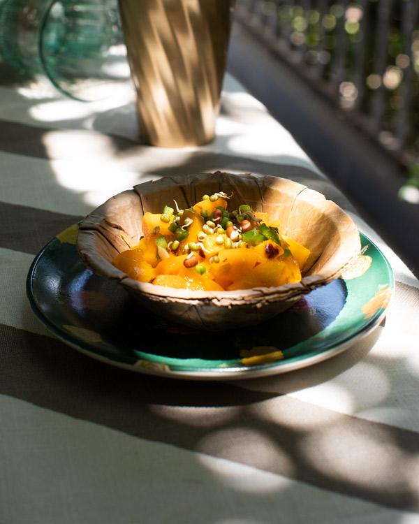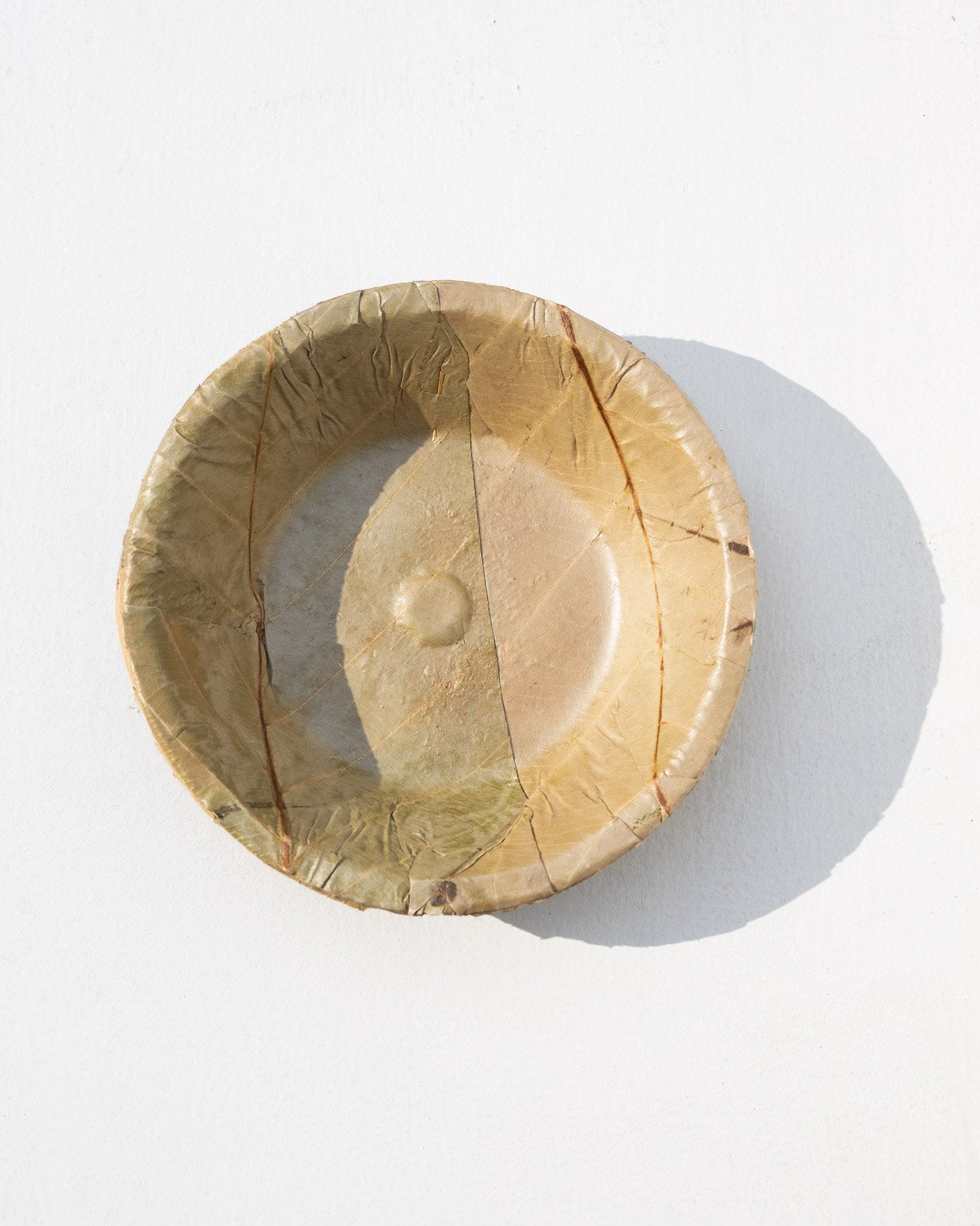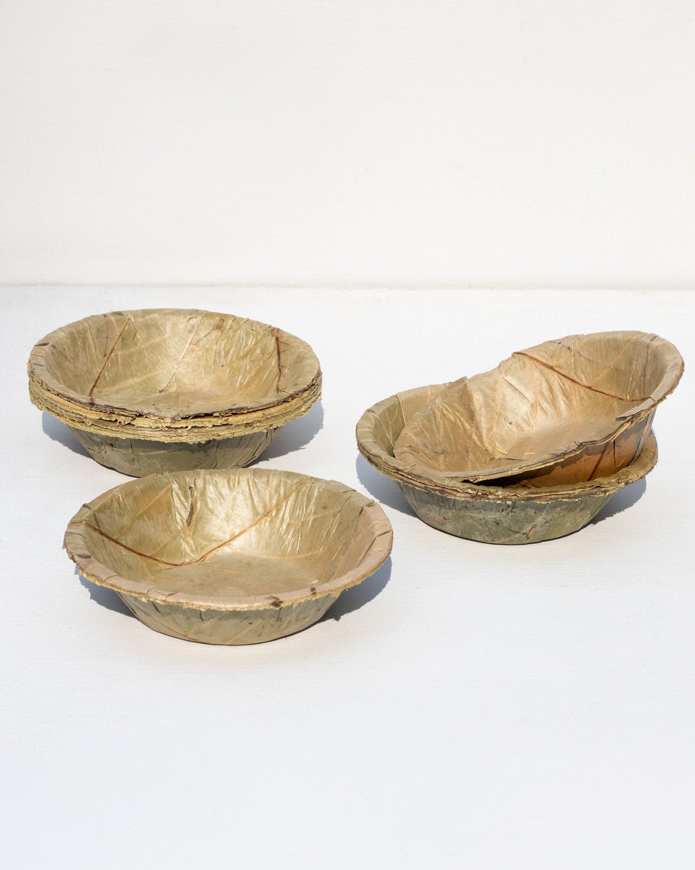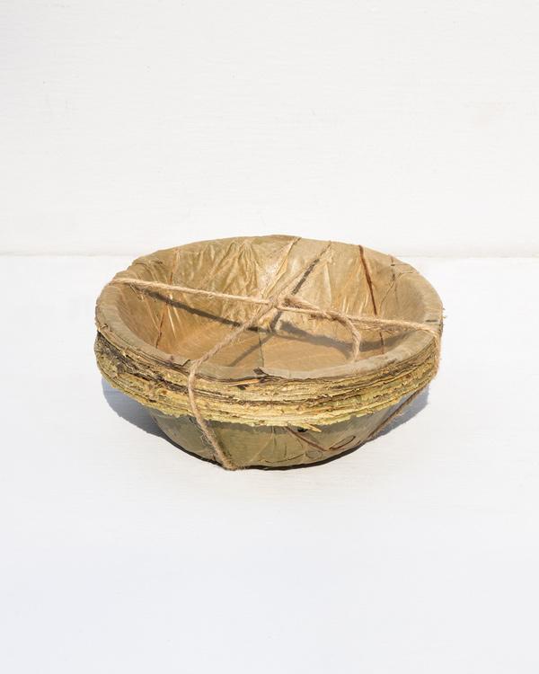 Handmade using leaves from the Sal tree that are held together by bamboo twigs, these plates will give you a dining experience that's filled with the sweet nostalgia of simpler times. Made with four layers of compressed leaves that hold their shape and are completely leak-proof, our pattal collection is completely biodegradable in 28 days���a high quality, green alternative to disposable plates and bowls.